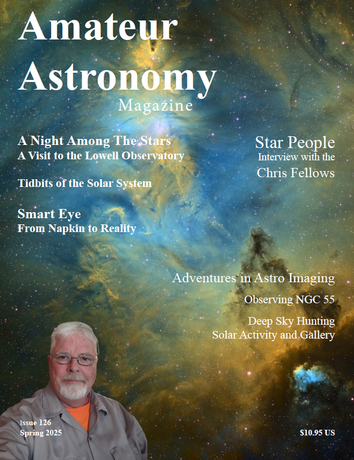 The 128th issue of Amateur Astronomy has been released. Everything has been pushed back a bit due to our relocating to Florida. This is the 73nd issue I have produced since taking over from Tom Clark 19 years ago. The cover of this issue is our Star Person: Chris Fellows with one of his deep narrow-band deep space captures behind him.